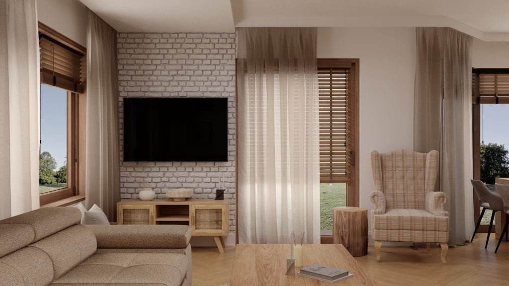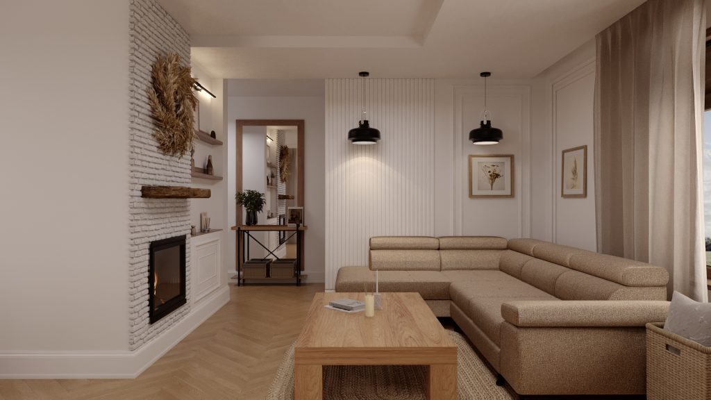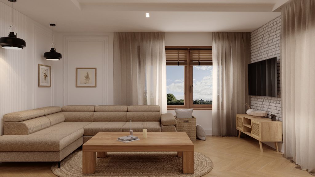 Prezentowane wnętrze to harmonijne połączenie nowoczesnej elegancji z naturalnym ciepłem stylu organic modern. Przestrzeń dzienna została zaprojektowana tak, aby zapewnić maksymalny komfort użytkowania, jednocześnie zachowując lekkość i spójność wizualną.