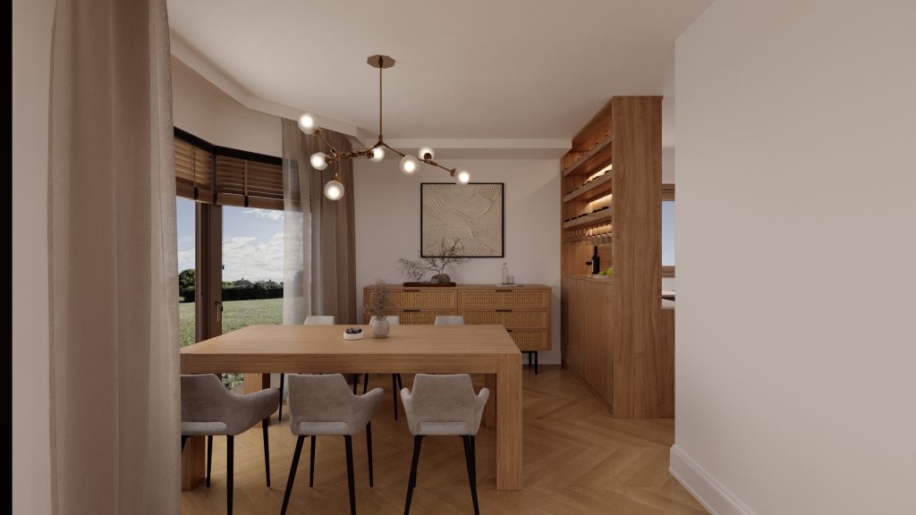 Część jadalniana zachwyca połączeniem prostoty i naturalnych materiałów. Duży drewniany stół otoczony tapicerowanymi krzesłami w odcieniach szarości komponuje się z komodą o frontach z plecionki rattanowej. Całość dopełnia elegancka, współczesna lampa sufitowa o rzeźbiarskiej formie, która pełni zarówno funkcję oświetlenia, jak i dekoracji.