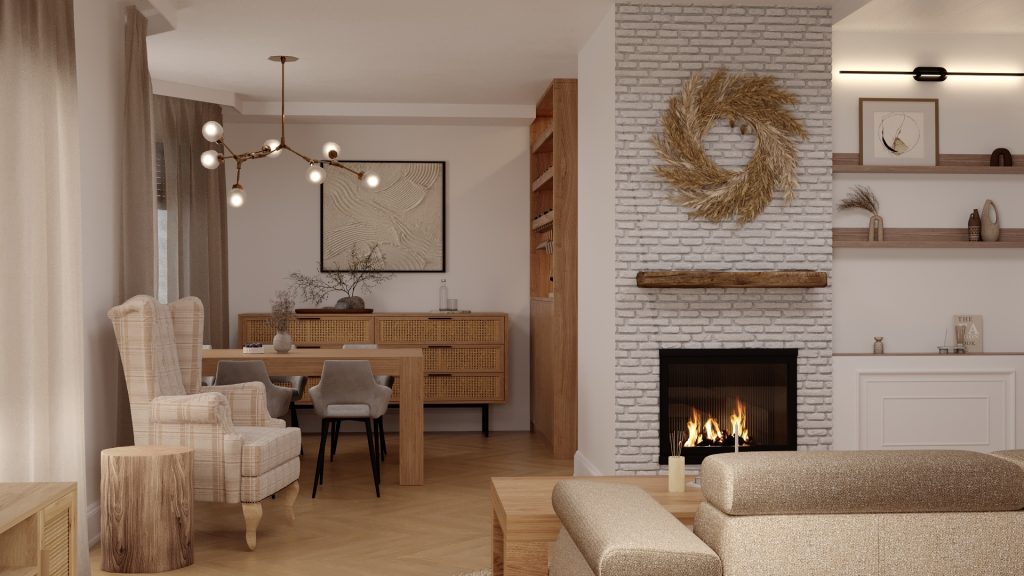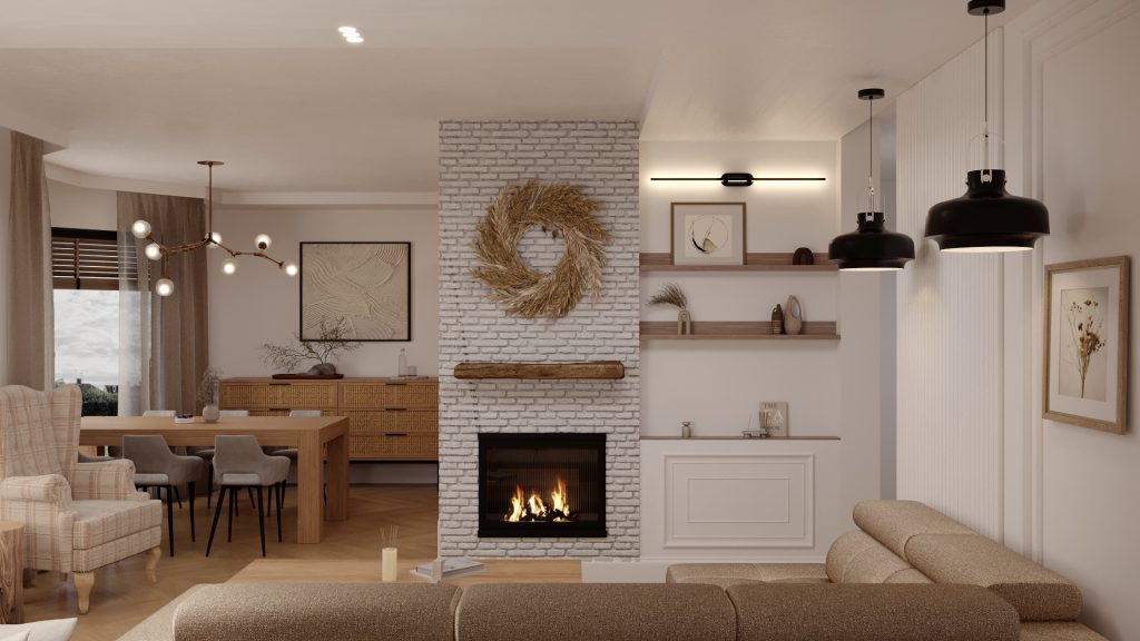 Centralnym punktem aranżacji jest kominek wykończony jasną, ręcznie układaną cegłą, uzupełniony rustykalną drewnianą belką, które podkreślają przytulny, naturalny charakter wnętrza. Obok kominka zastosowano minimalistyczne półki w odcieniu jasnego drewna, ozdobione subtelnymi dekoracjami, co dodaje przestrzeni lekkości i artystycznego klimatu.