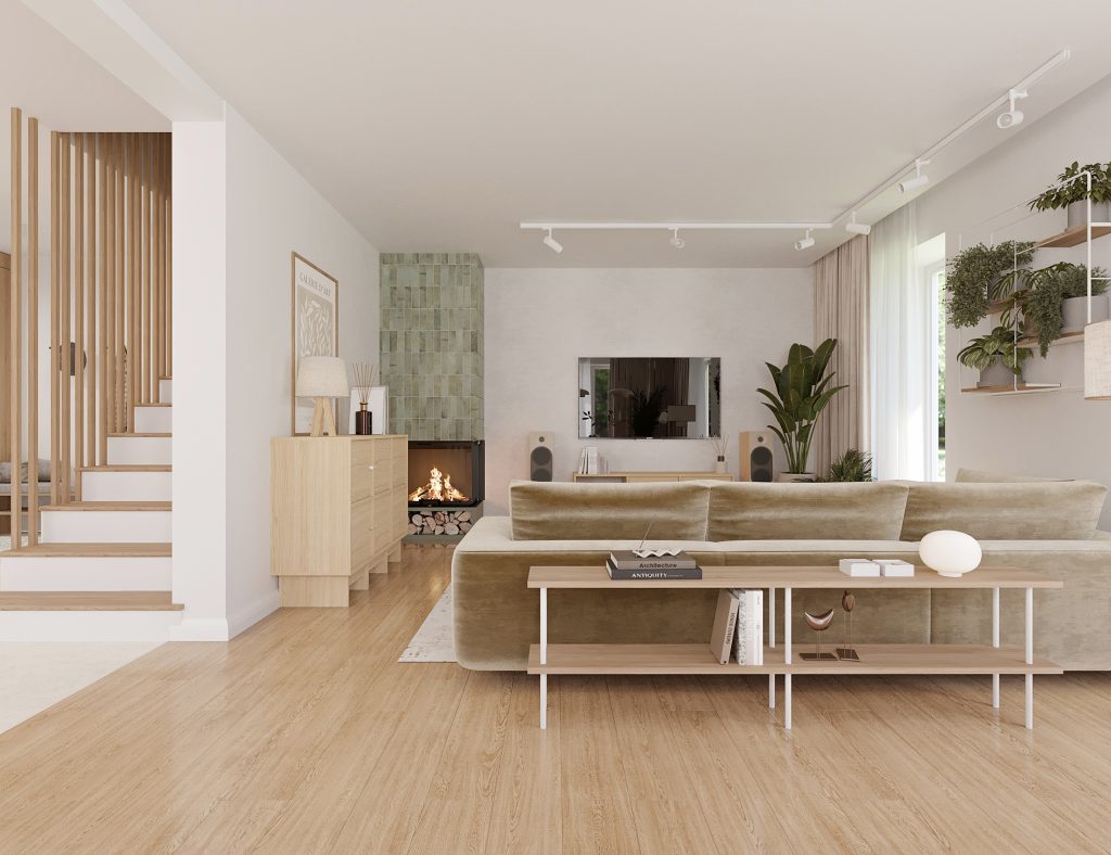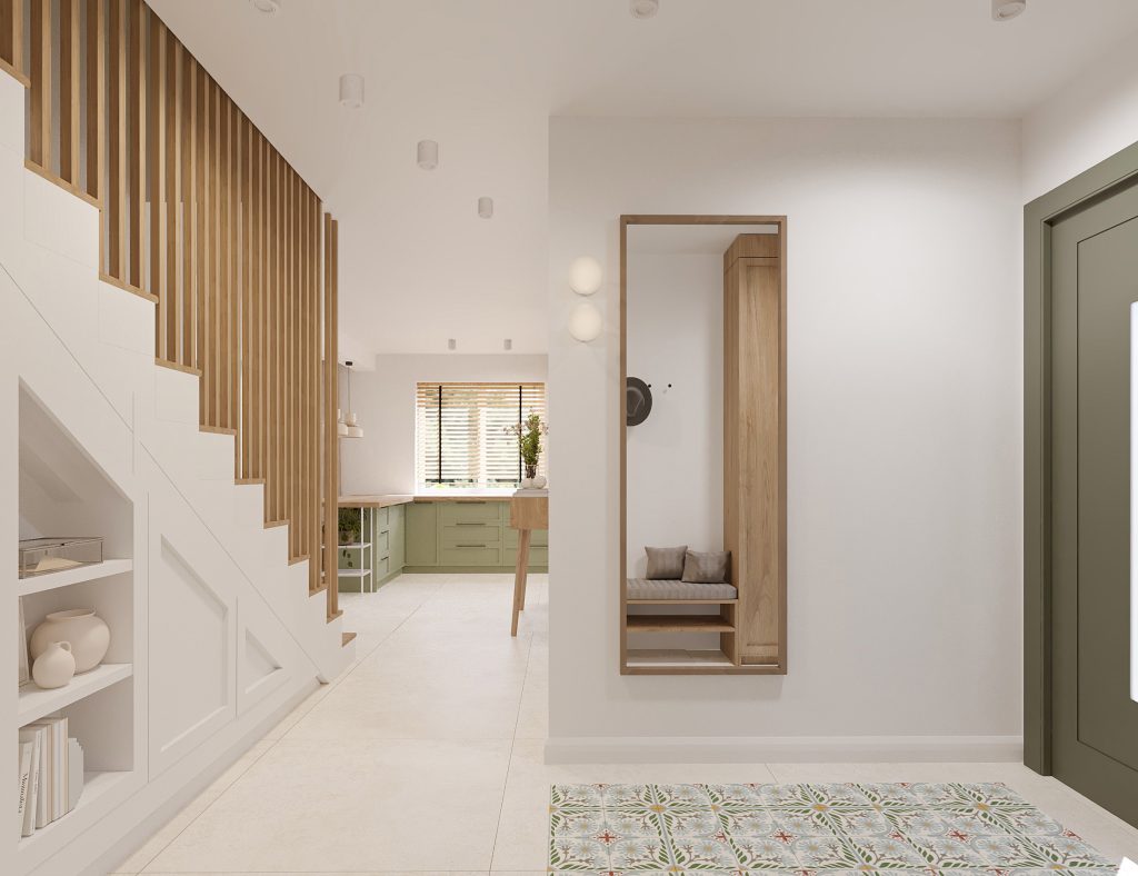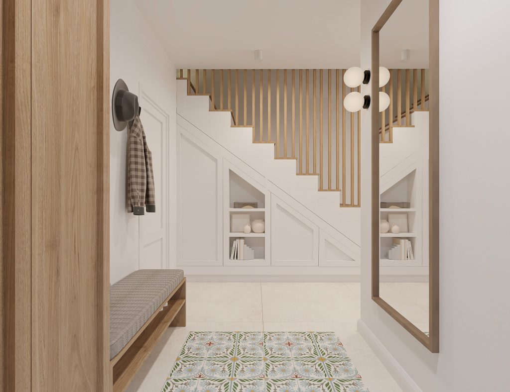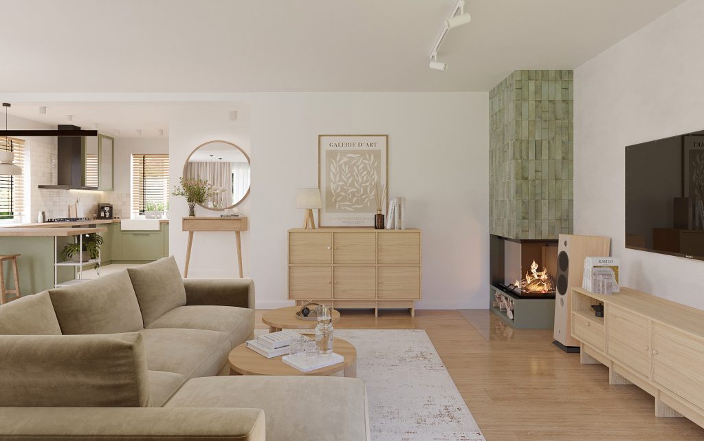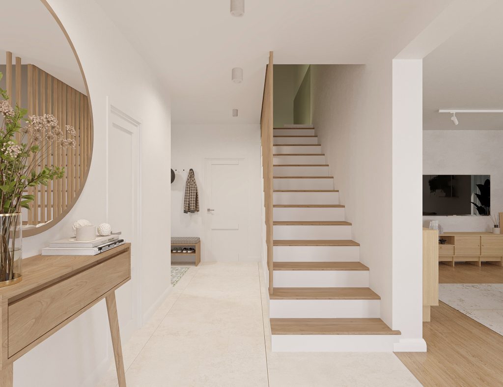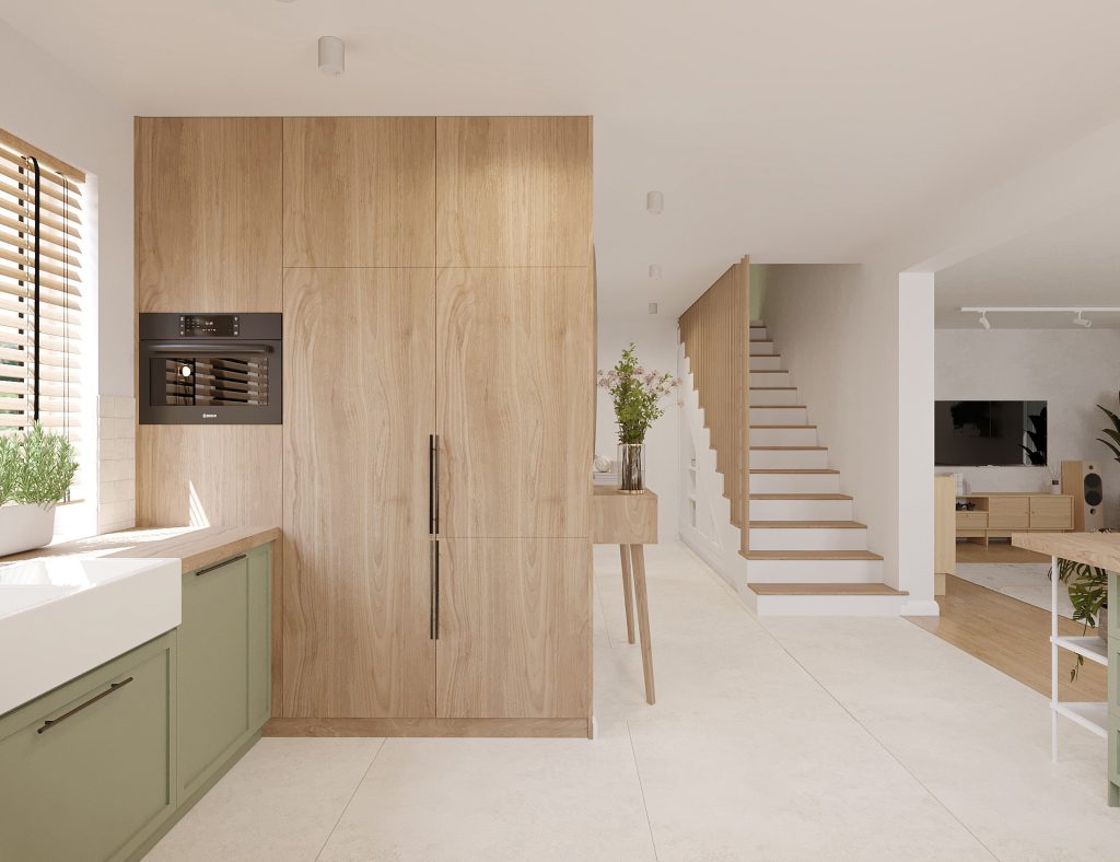 Projekt obejmuje aranżację kluczowych przestrzeni domu jednorodzinnego, tworzących spójną i funkcjonalną całość. Zaprojektowana kuchnia, salon z jadalnią oraz wiatrołap na parterze stanowią komfortową strefę dzienną, sprzyjającą codziennemu użytkowaniu i spotkaniom domowników. Uzupełnieniem projektu są łazienka na parterze oraz łazienka na piętrze, zaprojektowane z myślą o ergonomii, estetyce i ponadczasowych rozwiązaniach. Całość utrzymana jest w jasnej, nowoczesnej stylistyce z ciepłymi, drewnianymi akcentami, które dodają wnętrzu przytulności.