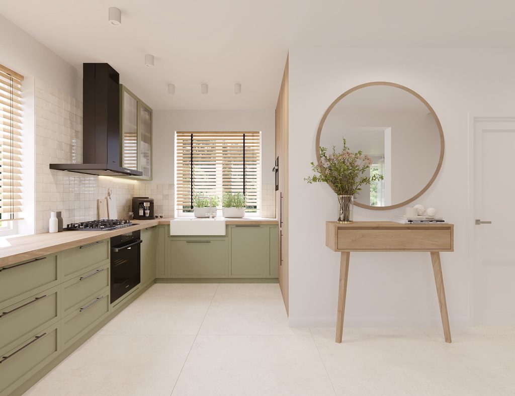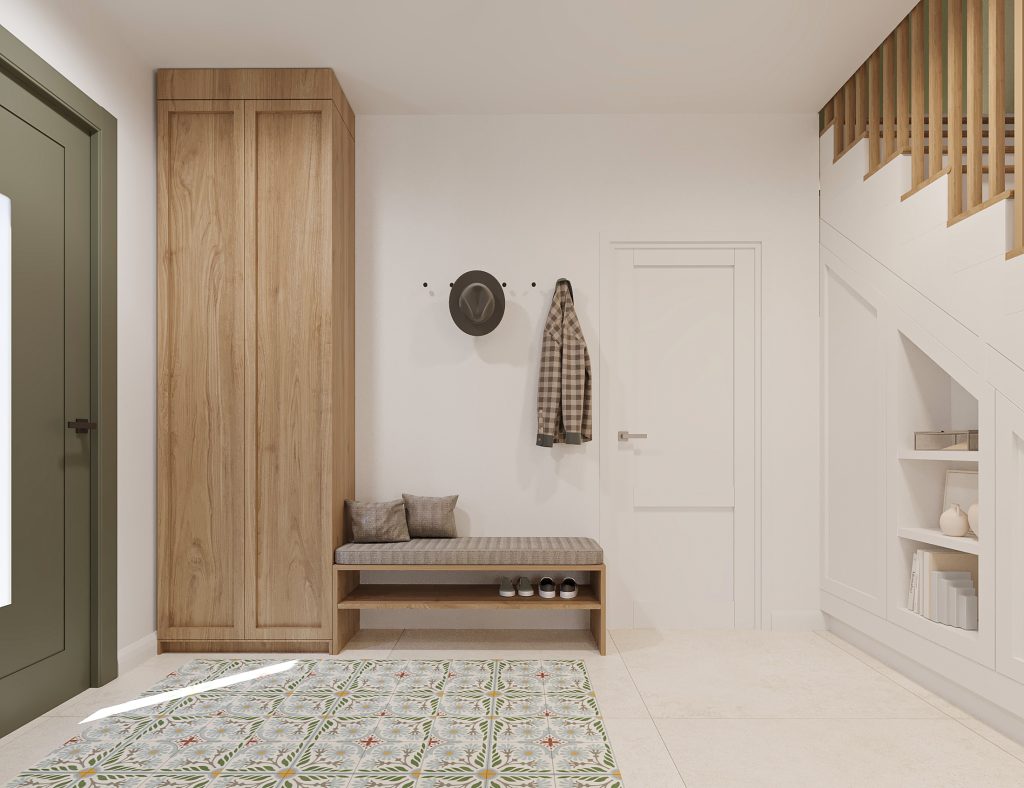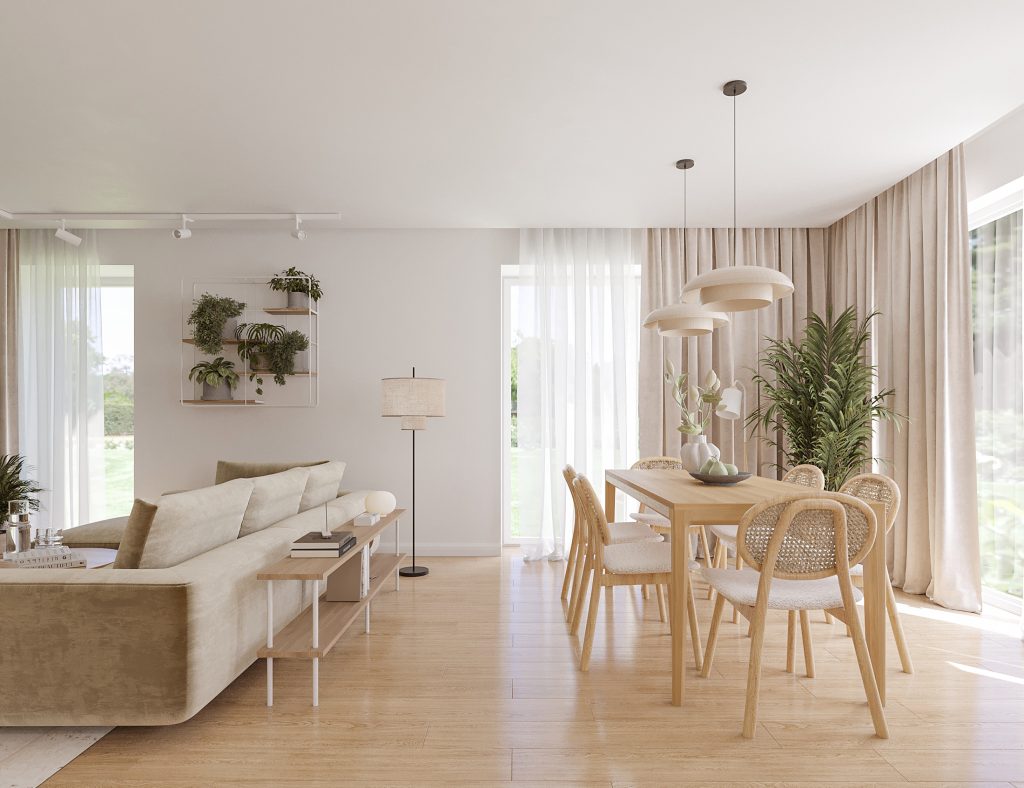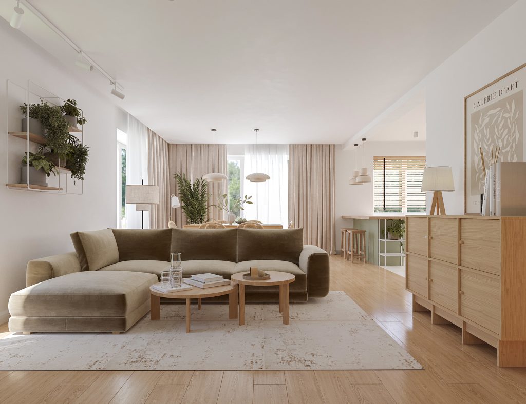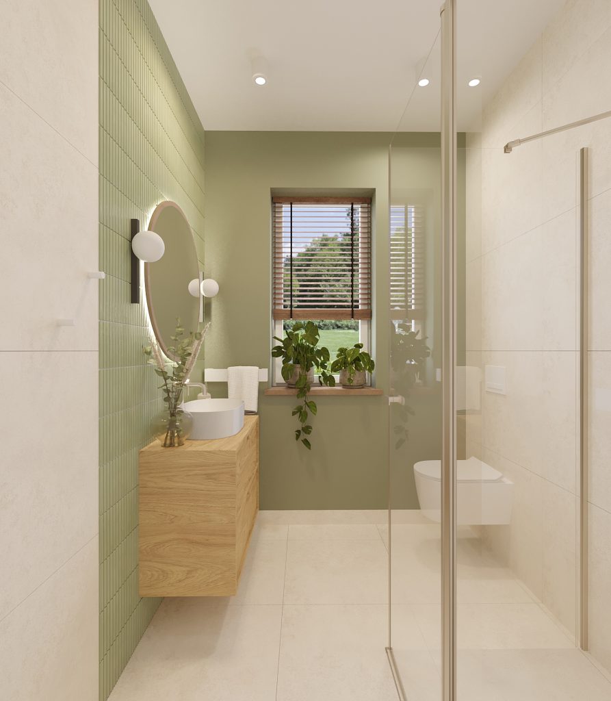 Projekt obejmuje aranżację kluczowych przestrzeni domu jednorodzinnego, tworzących spójną i funkcjonalną całość. Zaprojektowana kuchnia, salon z jadalnią oraz wiatrołap na parterze stanowią komfortową strefę dzienną, sprzyjającą codziennemu użytkowaniu i spotkaniom domowników. Uzupełnieniem projektu są łazienka na parterze oraz łazienka na piętrze, zaprojektowane z myślą o ergonomii, estetyce i ponadczasowych rozwiązaniach. Całość utrzymana jest w jasnej, nowoczesnej stylistyce z ciepłymi, drewnianymi akcentami, które dodają wnętrzu przytulności.